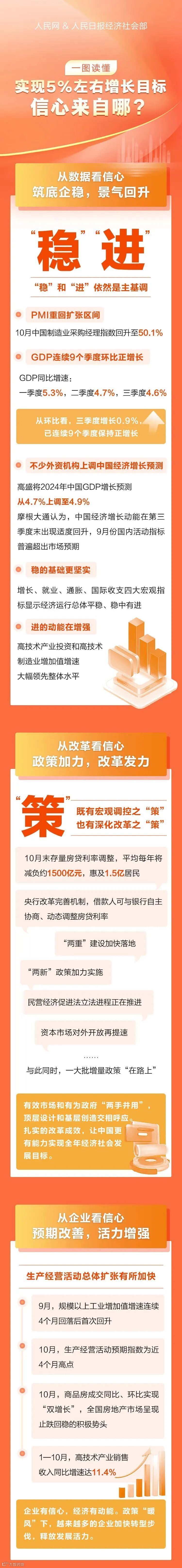 今年政府工作报告提出,全年经济增长预期目标为5%左右。前三季度GDP增长4.8%来之不易。时间进入11月份,中国经济如何实现“稳”和“进”?实现5%左右增长目标,信心来自哪?11月12日,人民日报头版发表金社平文章进行解读。我们梳理文章要点带您一图读懂。