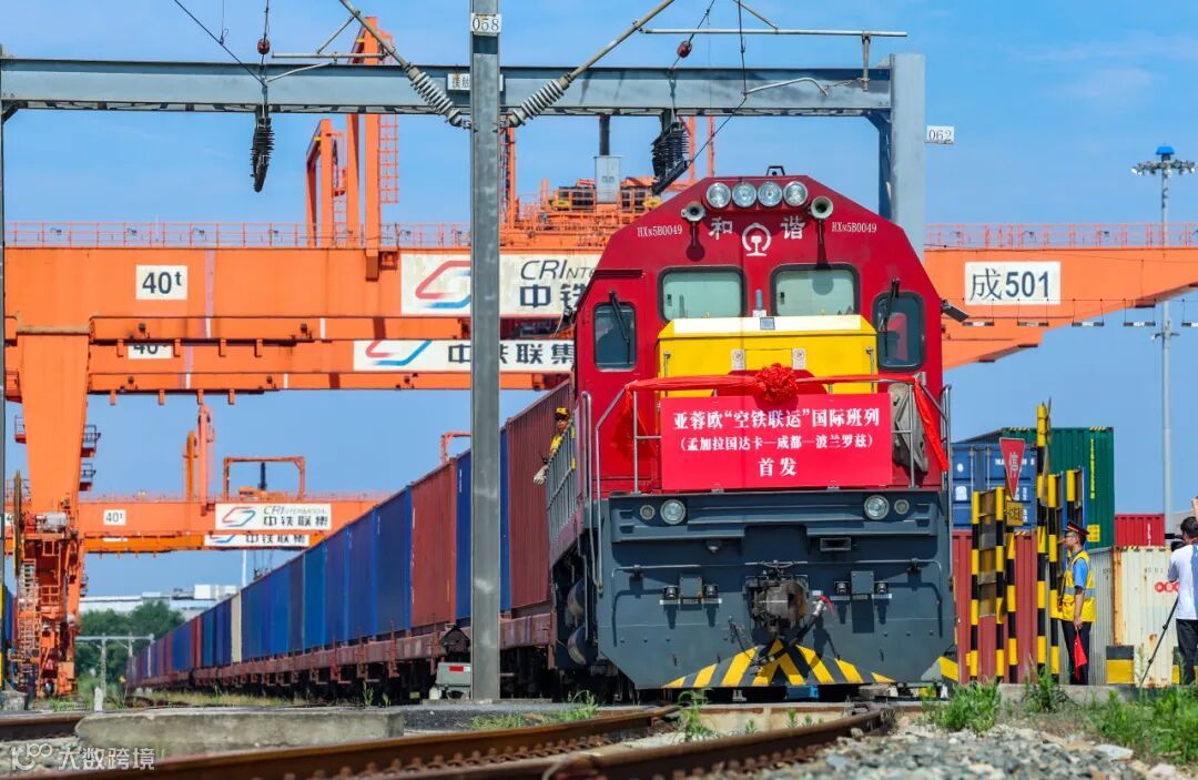 今年6月25日,一批来自孟加拉国的服装服饰,搭乘首列亚蓉欧“空铁联运”国际班列,从位于青白江区的成都国际铁路港发车,驶向波兰罗兹。这是全国首趟“空运4中欧斑列全程时刻表”班列。这趟新发班列无缝衔接“两港”(成都国际航空港、成都国际铁路港),实现亚蓉欧大通道提质护容。