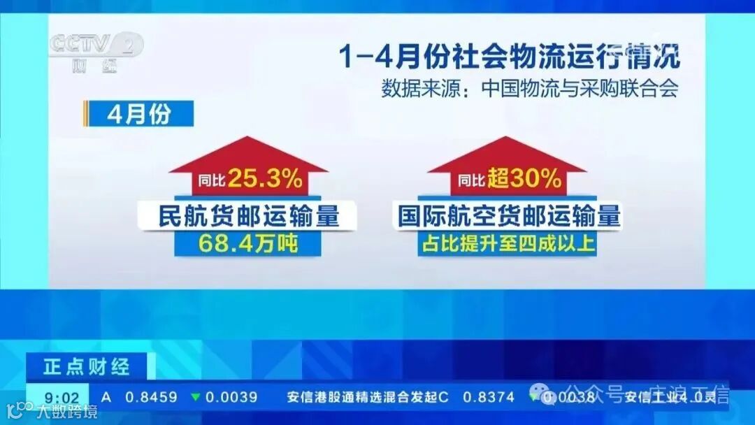 值得关注的是,跨境电商物流实现较快增长,带动航空物流需求增长。4月份,民航货邮运输量68.4万吨,同比增长25.3%,国际航空货邮运输量同比增长超过30%,占比提升至四成以上,航空货运推动物流国际化步伐有所加快。