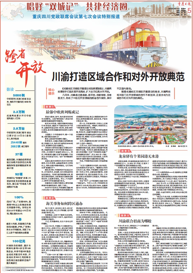 《成渝地区双城经济圈建设规划纲要》明确,要建设川渝自由贸易试验区协同开放示范区。在王欣看来,作为全国首个跨省域的自贸试验区合作平台,川渝自贸试验区协同开放示范区是推动川渝两地打造改革开放新高地的重要载体。