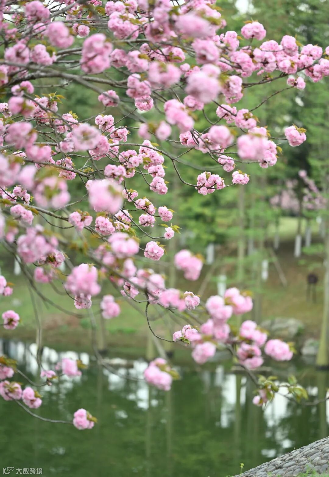 樱花红枝头,树木绿湖畔