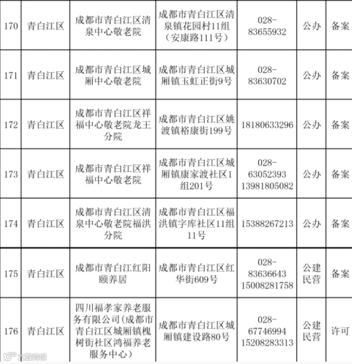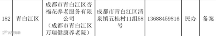 区民政局:近日,成都市民政局公布了一批通过备案(许可证在有效期)且正常运营的养老机构名单(截至2022年8月31日)。青白江有以下养老机构: