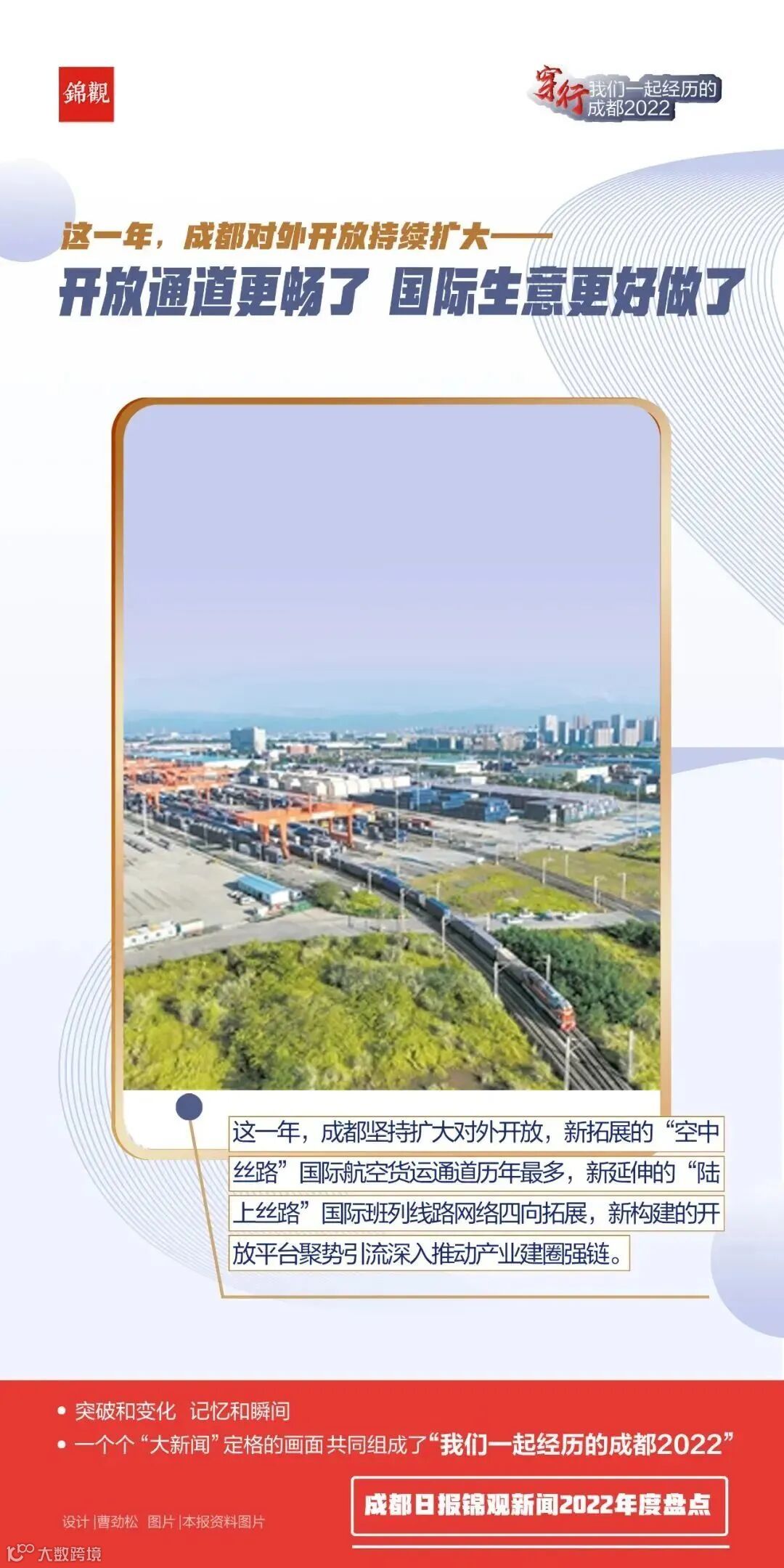 这一年,成都坚持扩大对外开放,新拓展的“空中丝路”国际航空货运通道历年最多,新延伸的“陆上丝路”国际班列线路网络四向拓展,新构建的开放平台聚势引流深入推动产业建圈强链。