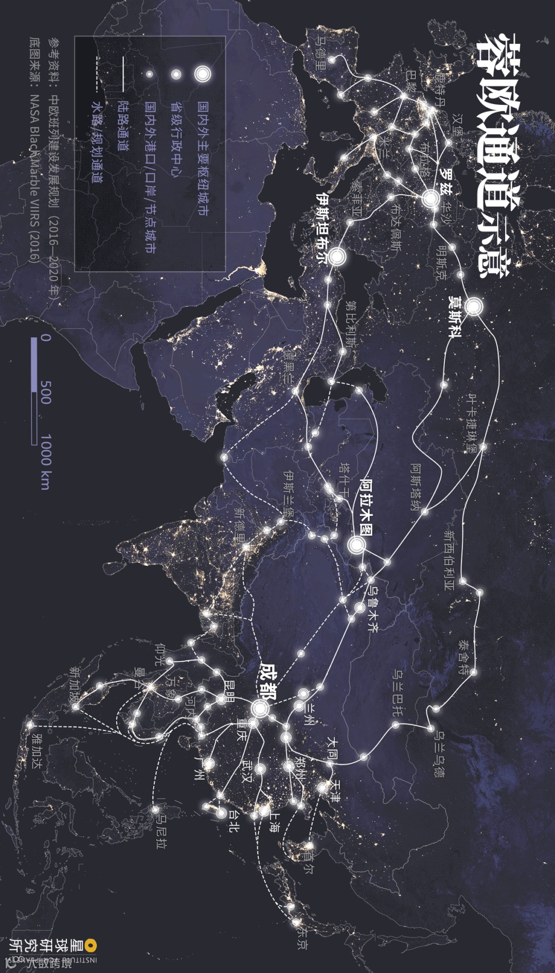 请横屏观看,成都国际班列通道示意图。以成都为枢纽,可连通境内外100余个城市 | 地图@陈志浩/星球研究所