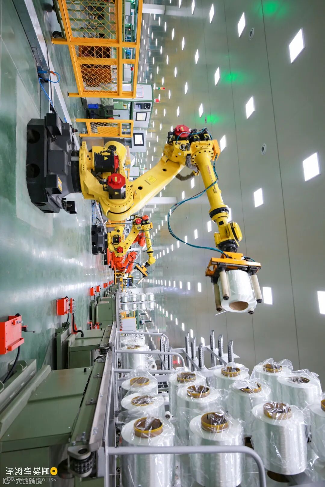 请横屏观看,巨石玻璃纤维生产车间内景。“细如银发”的玻纤材料,强度高,被广泛用于航天、电子产品生产 | 图片来源@中共成都市青白江区委宣传部