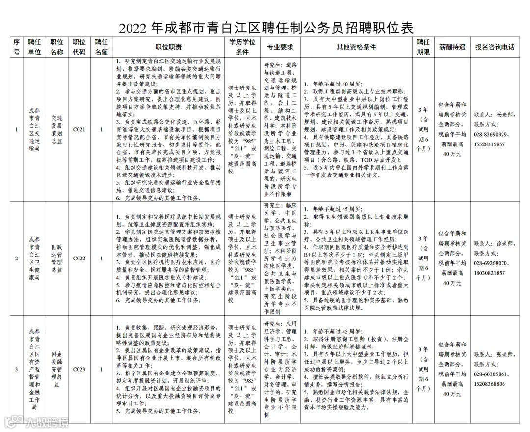 为进一步拓宽选人用人视野,吸引和使用优秀人才,着力建设一支高素质专业化治蓉兴蓉公务员队伍,为成渝地区双城经济圈建设、“一干多支”发展、成都都市圈建设和公园城市示范区建设提供坚强组织保证和人才智力支撑,经省公务员主管部门批准,2022年成都市将面向社会公开招聘47名聘任制公务员。其中,青白江区面向社会公开招聘3名聘任制公务员。