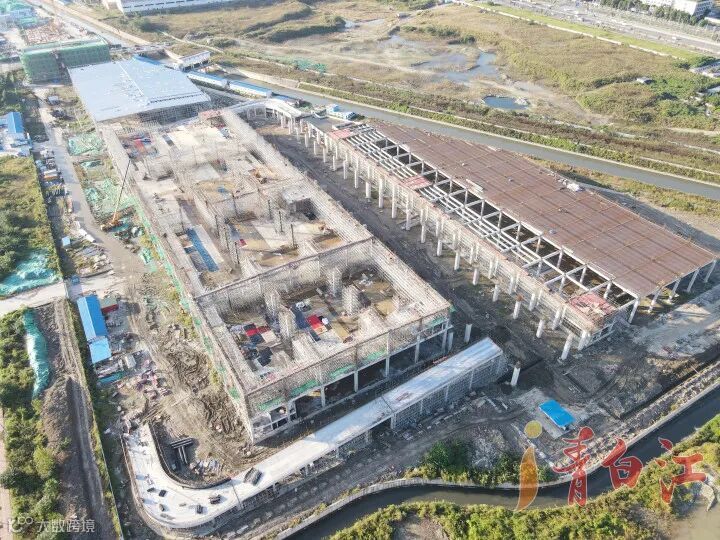 “我们现在看到的是一个专用坡道,用来连接一个大平台,大平台是一二号库的卸货场地。目前,一二号库正在加紧施工。往后就是综合楼,目前主体已经全部竣工。”