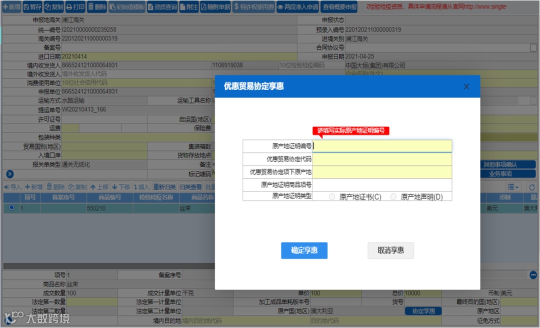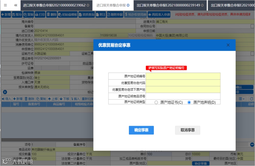 如该商品为享惠商品,请在“原产地证明商品项号”填入对应原产地证明商品项号,并点击“确定享惠”按钮。