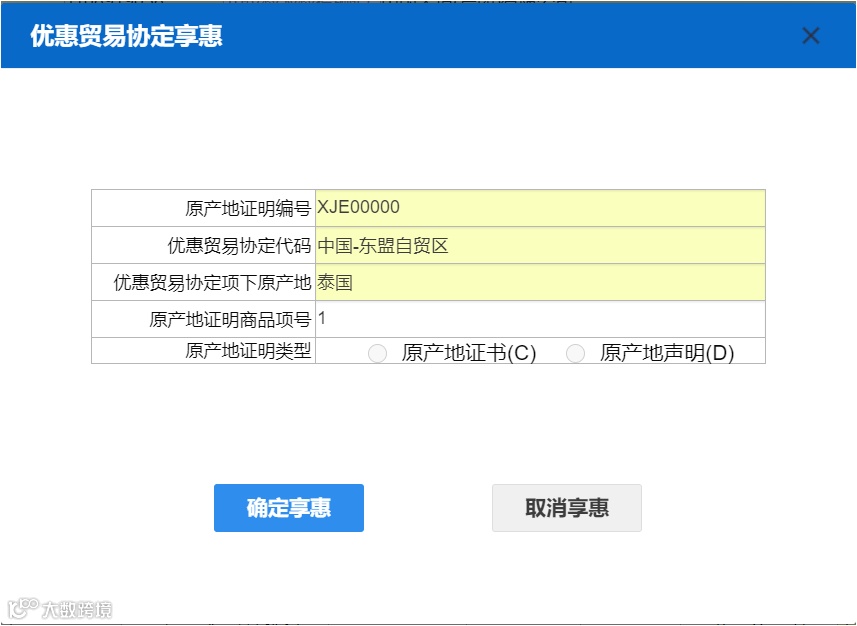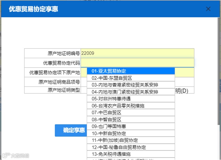 1.点击“协定享惠”按钮,在弹出的“优惠贸易协定享惠”对话框中,填写“原产地证明编号”。