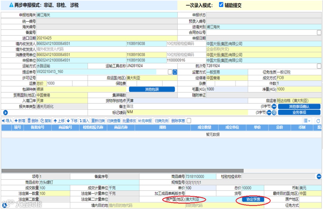 注意:协定代码01、03、04、14、21的协定没有小金额享惠规则,不允许申报小金额享惠。