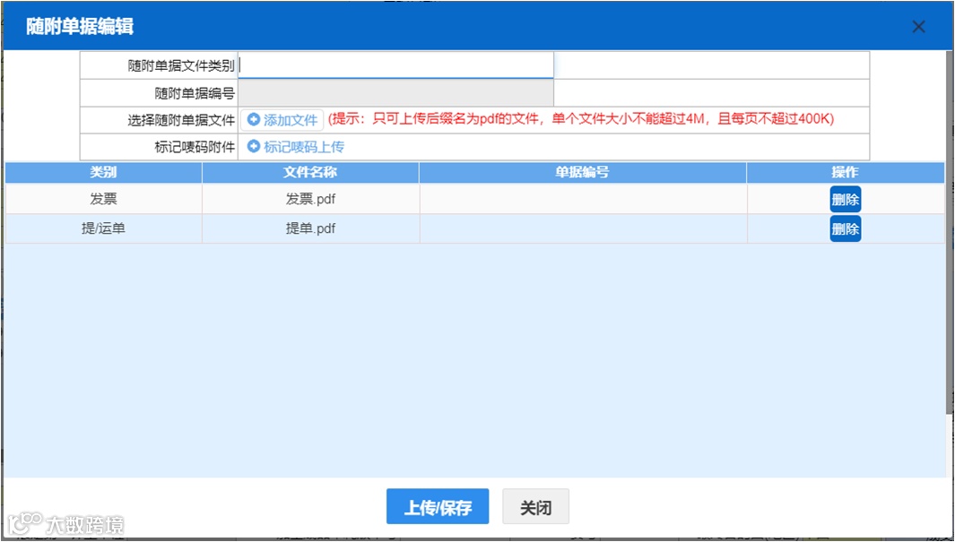 录入报关单所有商品项信息后,需在随附单据栏上传发票、运输单证文件等报关单随附单证的扫描件。