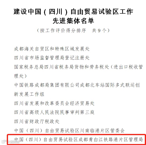 7月14日,成都国际铁路港荣获建设中国(四川)自由贸易试验区工作先进集体。