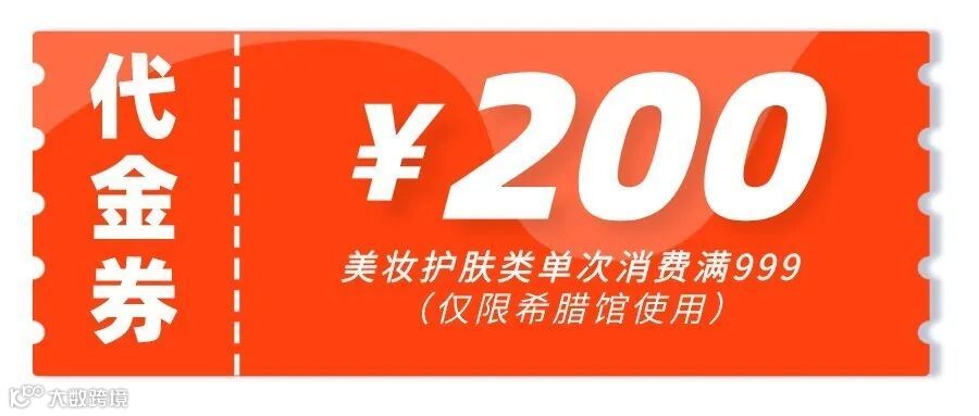 单次购买希腊馆美妆护肤系列,包括资生堂Shiseido、兰蔻Lancome、肌肤之钥CPB、香奈儿Chanel、巴宝莉Burberry、爱马仕Hermes等中高端品牌,产品包括水乳、面霜、精华、防晒、口红、眼影、香水等满999减200元。