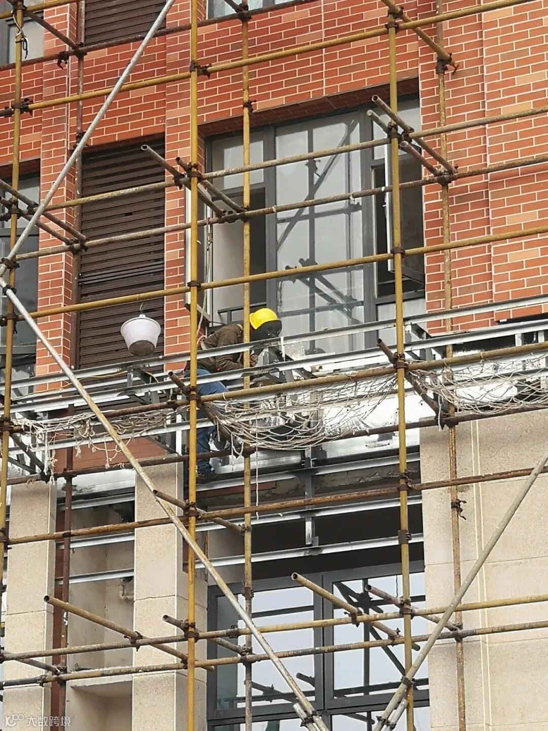 进入施工现场:机械轰鸣,标志性的罗马柱若隐若现地透露出一丝欧式建筑风格;脚手架上,工人正在进行石材加挂作业。