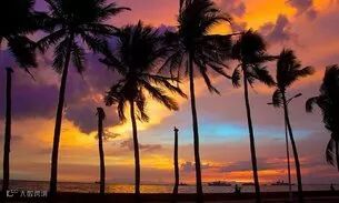 夕阳的余辉映照着海滨摇弋的椰树