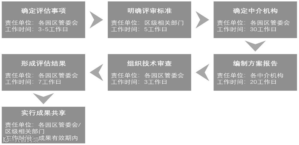 各园区管委会在收到评审相关要求后,在30个工作日内按程序委托具有相应资质的评估评审中介机构进行评估评审,并由中介机构在20个工作日内编制区域评估结果,明确适用范围、条件和时效等。
