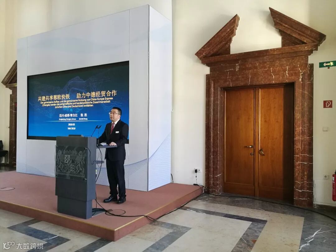 在四川-巴伐利亚州经贸合作交流会上,青白江区委书记张胜就中欧班列(成都)发展情况向与会嘉宾进行了内容推介。