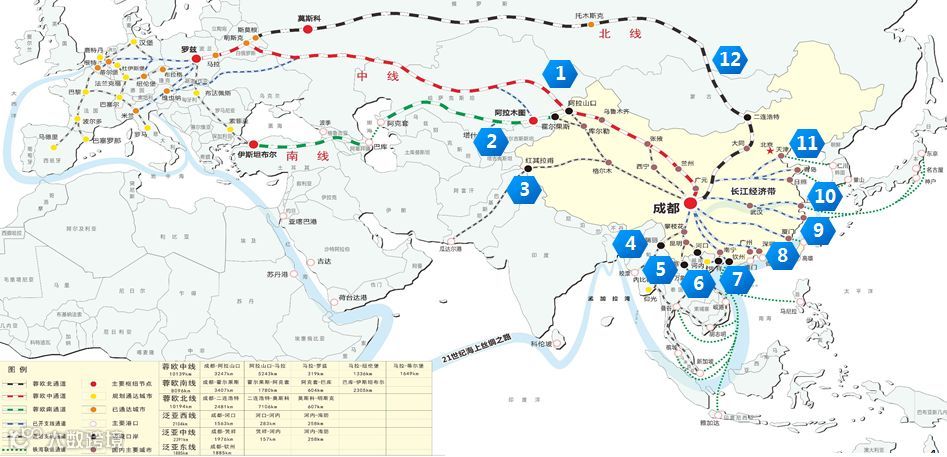 西向在中欧班列(成都)稳定运行基础上,形成经阿拉山口、霍尔果斯出境直达欧洲和中亚的泛欧铁路大通道,覆盖波兰罗兹、德国纽伦堡、荷兰蒂尔堡、比利时根特、捷克布拉格、意大利米兰等主要城市。