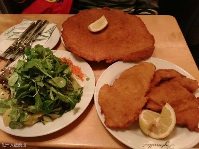 吃过了甜点,自然要来份饱腹的硬菜。虽然世界各地都有这种裹上面包屑炸制的肉食,但维也纳炸猪排被誉为奥地利“国菜”的鼎鼎大名让它成为游客的必点。