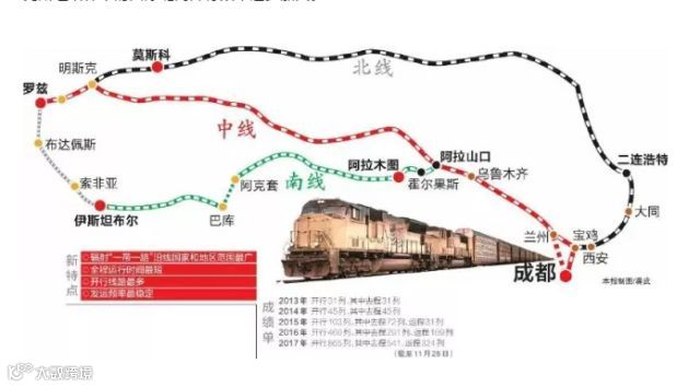 5、蓉欧快铁加密运行,2017年国际班列达1012列,货值40亿美元、增长207.7%,成为全国开行数量最多、运行最稳定的中欧班列。不断做强做优口岸功能,成都铁路口岸等功能平台先后建成,西部首个自贸区平行进口车交易展示中心投入运营,成都铁路保税物流中心(B型)监管额和关税位居全省首位。