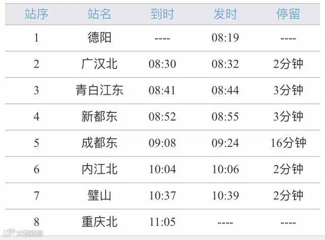 G8751,途径德阳、广汉北、青白江东、新都东、成都东、内江北、璧山、重庆北。上午8:19从德阳出发,8:41到达青白江,8:44出发到成都,11:05分到达重庆北,这样早晨从青白江出发,中午就可以吃到重庆火锅了。