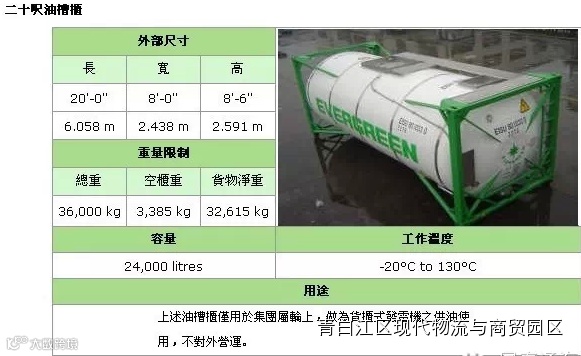 备注:这种集装箱是专为装运液体货物,如酒类、汽油、化学品而设计的