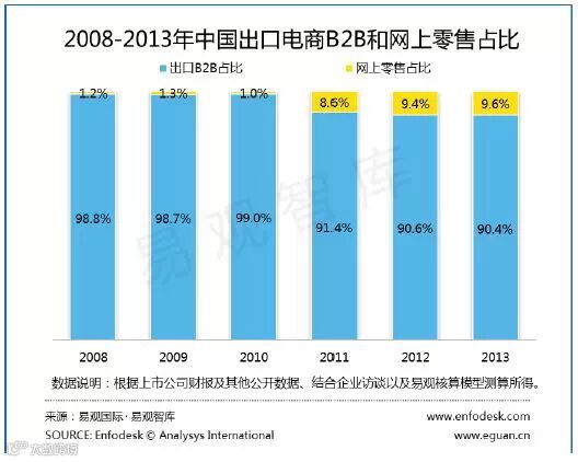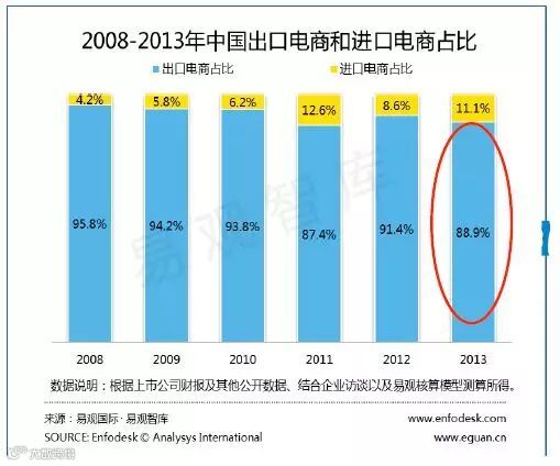 2013年,88.9%的跨境电商交易额由出口电商贡献,进出口结构失衡,出口电商是跨境电商的主力军。