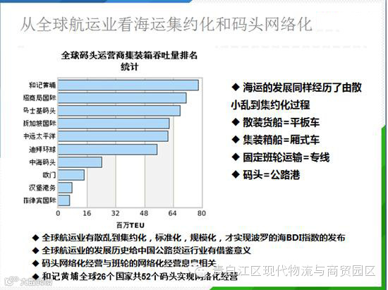 2、物流园区网络化经营是趋势。尽管困难重重,但不妨碍各类外资,央企,国企,民企,混合所有制企业手握重金投资全国物流园区网络,并已经开始着手网络化经营。作为对标,全球海运发展史同样经历了无序竞争到目前巨头竞争的时代。其中,港口和码头的网络化经营已经在全球范围实现,如下图,2012年统计数据表明,和记黄埔已经在全球26个国家,实现了52个码头的网络化经营,并助力其成为世界500强公司。各位看官可以研究下和记黄埔与海运发展史,必定大有收获。