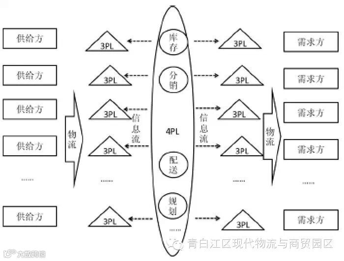 从图5可以看出,第四方物流更多的是集成供应链中的各个主体,并为它们提供库存、分销、配送和物流规划等方面的管理咨询,这要求第四方物流服务商具有整条供应链中的数据支持和处理分析能力。