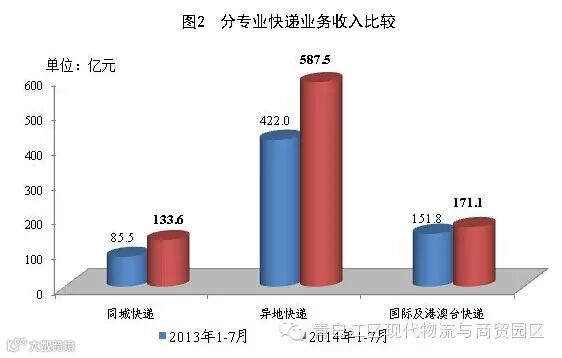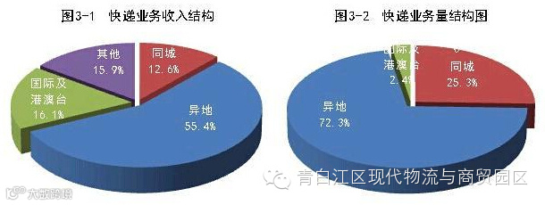 1-7月份,同城、异地、国际及港澳台快递业务收入分别占全部快递收入的12.6%、55.4%和16.1%;业务量分别占全部快递业务量的25.3%、72.3%和2.4%。与去年同期相比,同城快递业务收入的比重上升1.1个百分点,异地快递业务收入的比重下降1个百分点,国际及港澳台业务收入的比重下降了4.2个百分点。