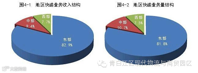1-7月份,东、中、西部地区快递业务收入的比重分别为82.9%、9.4%和7.7%,业务量比重分别为81.8%、10.7%和7.5%。与去年同期相比,东部地区快递业务收入比重下降了0.2个百分点,快递业务量比重上升了0.8个百分点;中部地区快递业务收入比重上升了0.2个百分点,快递业务量比重下降了0.4个百分点;西部地区快递业务收入比重持平,快递业务量比重下降了0.4个百分点。
