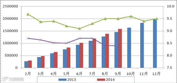 市场价格震荡走低。近几年,由于物流需求增速回落、物流企业竞争加剧,物流市场价格震荡走低,长期保持低位运行。9月份,中国物流景气指数中的物流服务价格指数为49.2%,位于50%以下。从海运市场看,受国内铁矿石及钢材需求增速放缓、煤炭运输需求疲软等因素影响,沿海散货市场需求持续低迷,加之市场运力过剩,综合指数震荡走低。9月份,中国沿海散货综合指数平均为913.0点,环比下降2.4%,同比下降19.5%;1-9月,中国沿海散货综合指数平均为1014.8点,同比下降2.4%,降幅与1-8月基本持平。