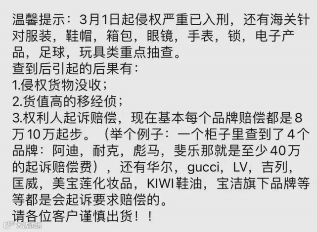 从3月1日起,严重的货物侵权行为已入刑,海关将针对服装、鞋帽、箱包等等产品进行重点抽查。