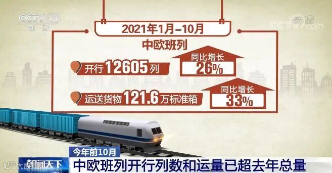据了解,今年1月至10月,中欧班列开行12605列、运送货物121.6万标准箱,同比分别增长26%和33%;开行列数和运量均超2020年全年总量,实现了班列开行数量和货物发送量双增长。