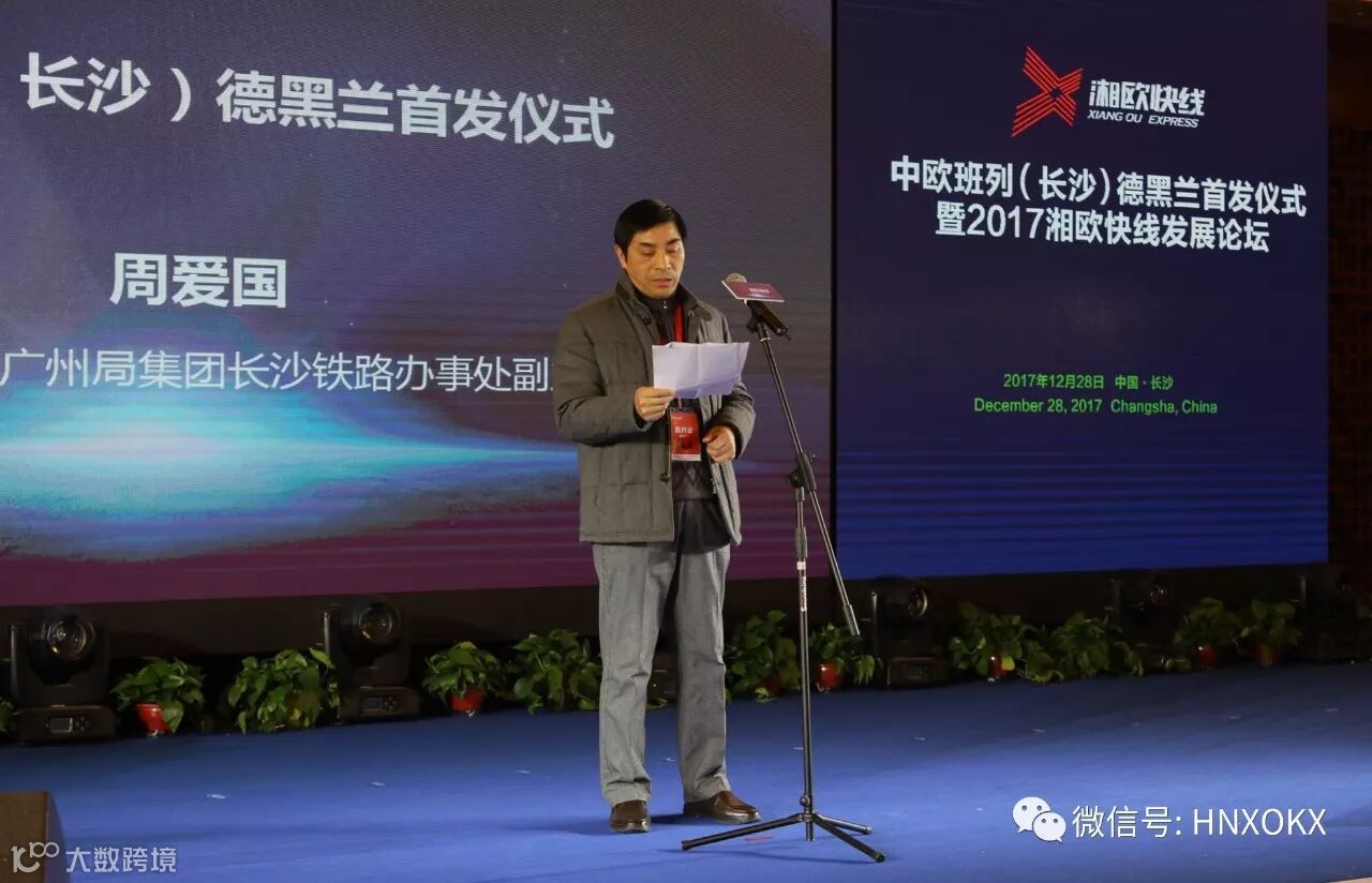 中国铁路广州局集团有限公司长沙铁路办事处周爱国副主任在致辞中说道:“长沙—伊朗—德黑兰班列是中欧班列首创线路,途径哈萨克斯坦,土库曼斯坦,全程10297公里,运行时间14天,是辐射整个中东地区的物流枢纽,是长沙市湖南省连接省内城市,辐射华南华东地区的核心枢纽,湘欧快线班列必将为湖南省实现创新引领,开放崛起做出积极贡献,为促进湖南省外贸招商引资发展,发挥更大更好的作用,在此我代表广铁集团承诺,我们必将再接再励做好长沙中欧班列,做好海关监管区的建设,全力推动长沙北货场一类铁路口岸的建设,力争把长沙打造成国际的陆港平台。”