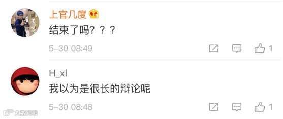 而在中国社交媒体微博上,一大票中国网友对于这场“跨洋对话”的总体反应则是: “结束得太快”。↓