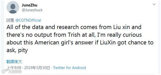 有人在推特上称赞刘欣在节目中“摆出的有力事实和数据”。网友“JuneZhu”表示:“所有的数据与研究都来自刘欣,崔西却没有任何输出。如果刘欣有机会提问,我真的很好奇这个美国女孩的答案,遗憾。”↓