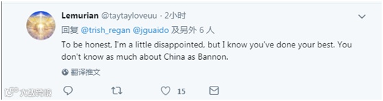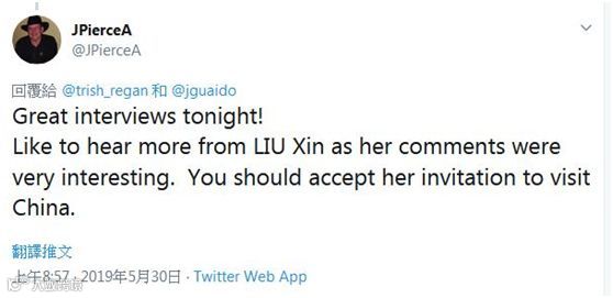 也有美国网友在崔西的个人推特下评论,将这次对话形容为一场“很棒的采访”。“我想从刘欣那里听到更多,她的评论非常有趣。你(崔西)应该接受她的访华邀请。”↓