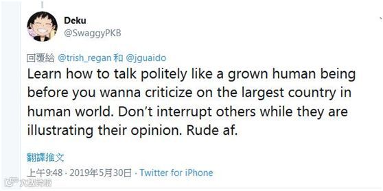 网友“Deku”也指责崔西说:“在想批评世界上最大的国家之前,先学会像成年人一样礼貌地说话。当别人阐述自己观点的时候,不要打断他人。粗鲁。”↓