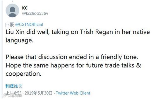 网友“KC”则表示,刘欣用崔西·里根的母语和她较量,这很棒。“请以友好的语气结束这次讨论,希望今后的贸易谈判与合作也能如此。”↓