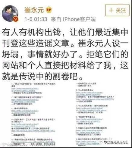 今天凌晨1点33分,@崔永元写道:有人有机构出钱,让他们最近集中刊登这些造谣文章。崔永元人设一坍塌,事情就好办了。拒绝它们的网站和个人直接把材料给了我,这就是传说中的副卷吧。