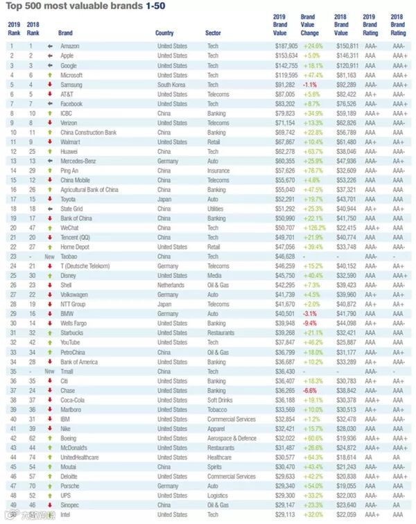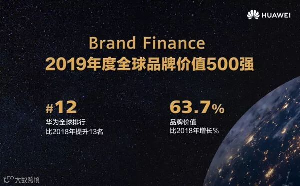 刚刚,英国权威品牌价值咨询公司Brand Finance发布《2019年度全球品牌价值500强》!中国的华为再次大步跃进,凭借4000亿元的品牌价值从2018年的25位提升至12位,品牌价值同比提高63.7%!