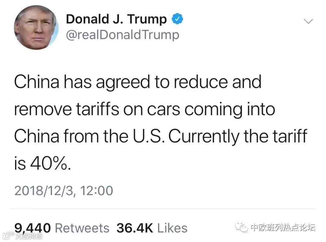 12月3日,特朗普率先发推特称中国已同意下调产自美国的汽车关税,从40%降回15%。