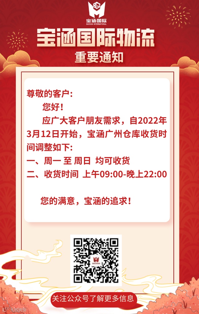 导读:尊敬的客户:您好!应广大客户朋友需求,自2022年月12日开始,宝涵广州仓库收货时间调整如下:一、周一至周日 均可收货二、收货时间 上午09:00-晚上22:00您的满意,宝涵的追求