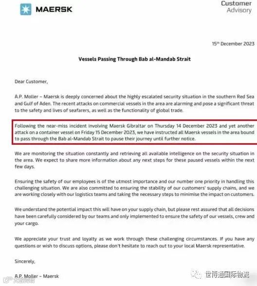 获悉,马士基和达飞在周末便发布了通知宣布旗下所有船舶停止红海通行!