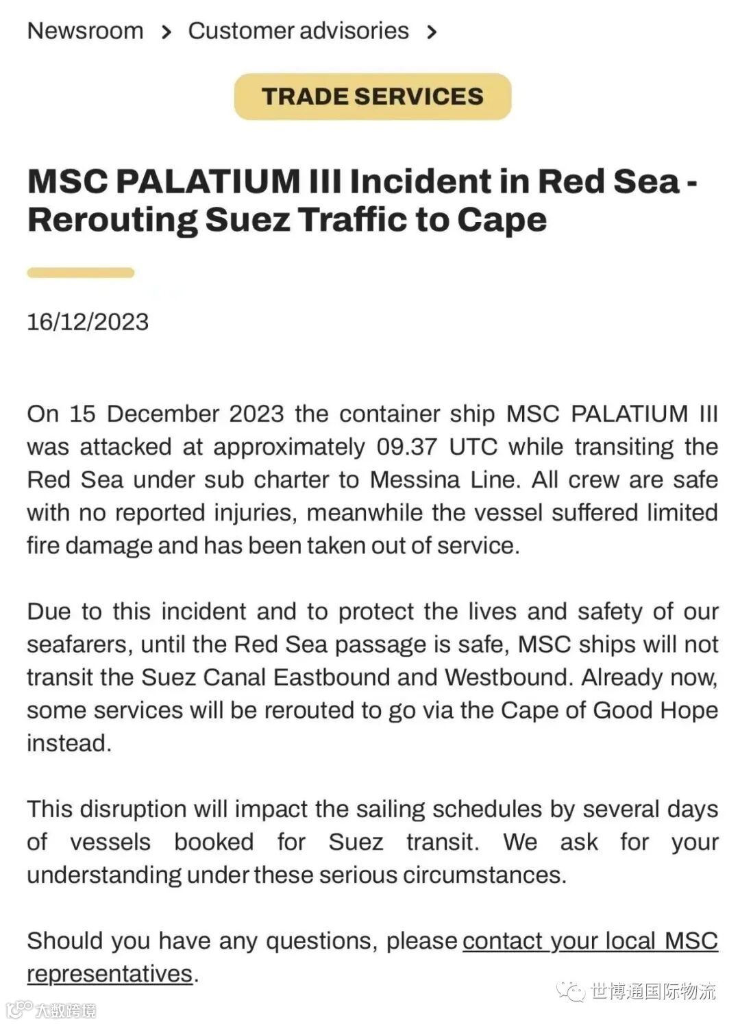 此外,有货代表示,地中海航运(MSC)目前只是通知绕行非洲南端的好望角,并没有暂停相关方向货物接载。赫伯罗特(Hapag-Lloyd)已经通知,除VIP客人之外,中东航线,红海航线,以及地中海航线的西岸和东岸均暂停接受订舱,等待后续通知。
