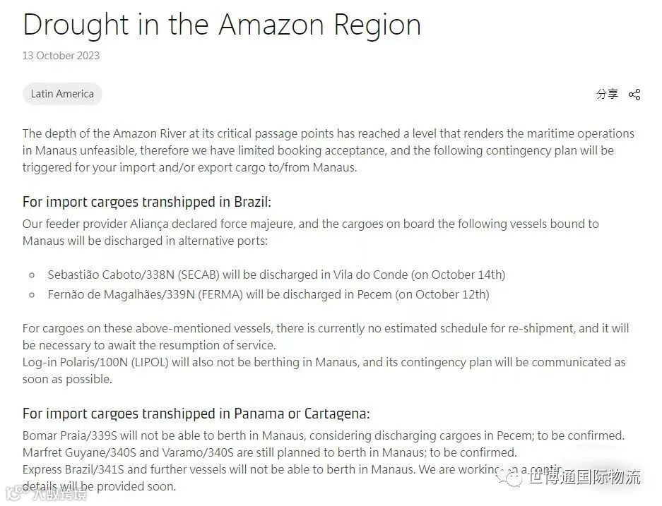 马士基也向其客户通报了应对亚马逊日益恶化环境的应急计划。该公司表示:“我们的支线服务商Alianca宣布,由于不可抗力,驶往玛瑙斯的船只上的货物将在其他港口卸货。”