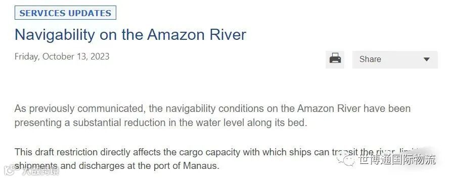 达飞轮船表示:“造成这些限制的天气条件不稳定,这导致无法准确地提供改善的预测。一旦水位允许,这些船上的货物将被运往玛瑙斯。”