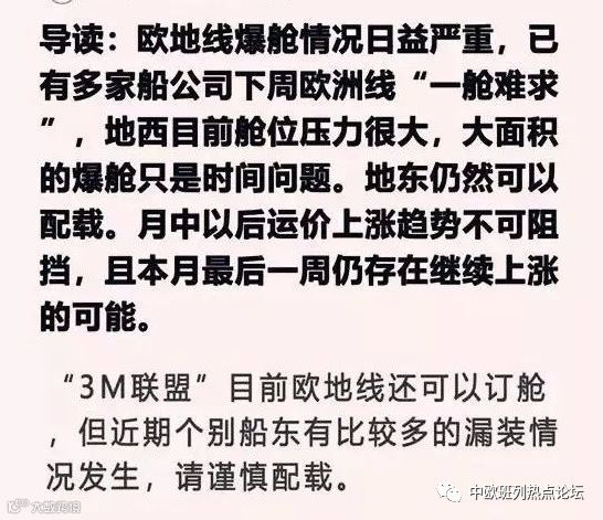最新消息显示:近期欧地线爆仓情况日益严重,已有多家船公司欧洲线面临“一舱难求”的状况。