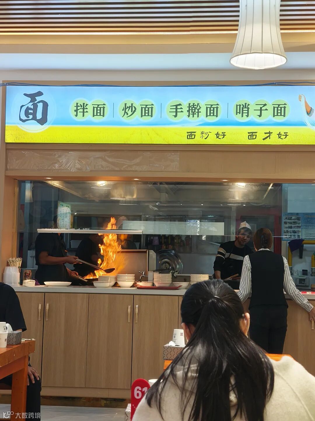 吃完以后,几点体会:一是拌面颜色比正常的要黑,口感确实非常好,吃起来舒服。二是点的碎肉肉超级多,是我目前吃过的碎肉中给的最多的,不过感觉稍有些油腻。三是现场环境感觉是那种中式的,木凳木桌,古色古香。四是厨房开放式的,可以看到大厨炒菜,民族小哥在手工拉面,感觉不错。